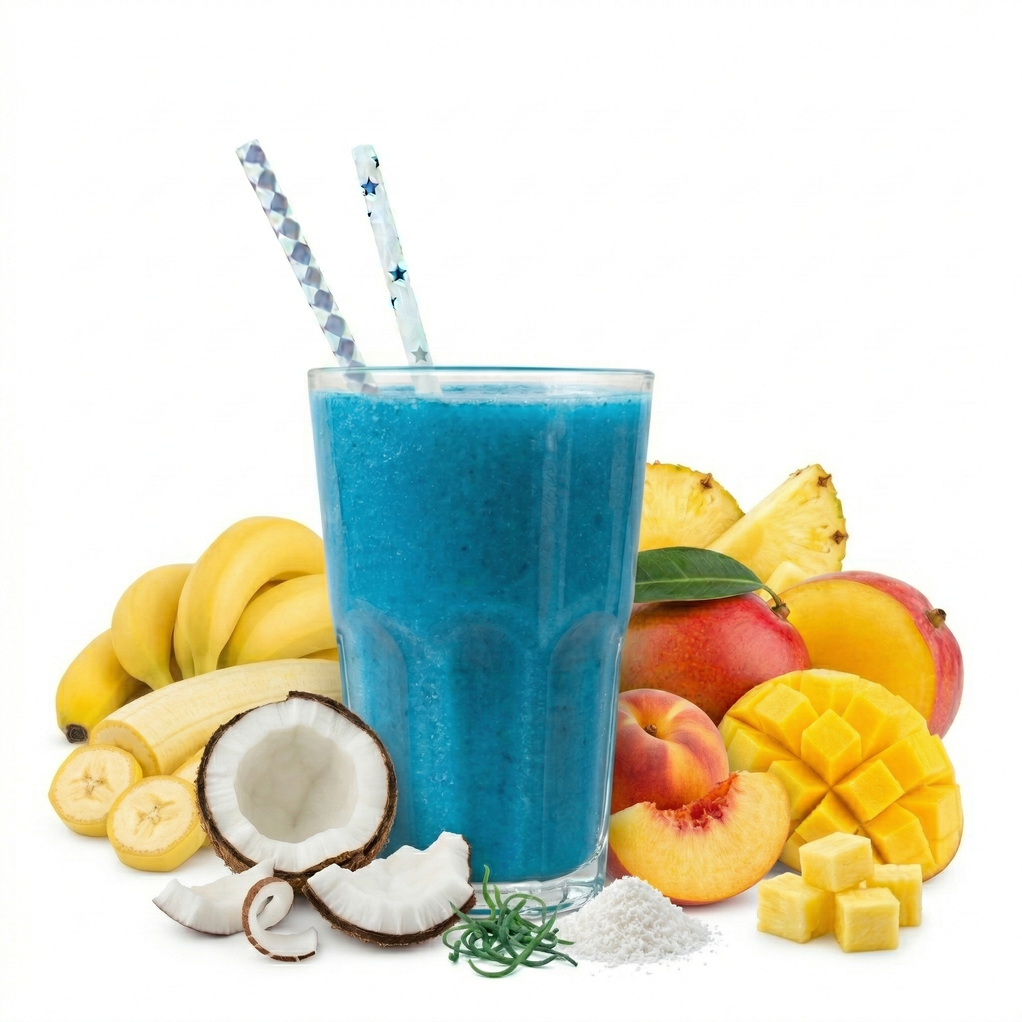Plátano, mango, melocotón, pinã, leche de coco y espirulina azul