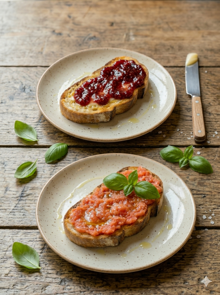 Tostadas con mermelada y mantequilla / tomate y aceite